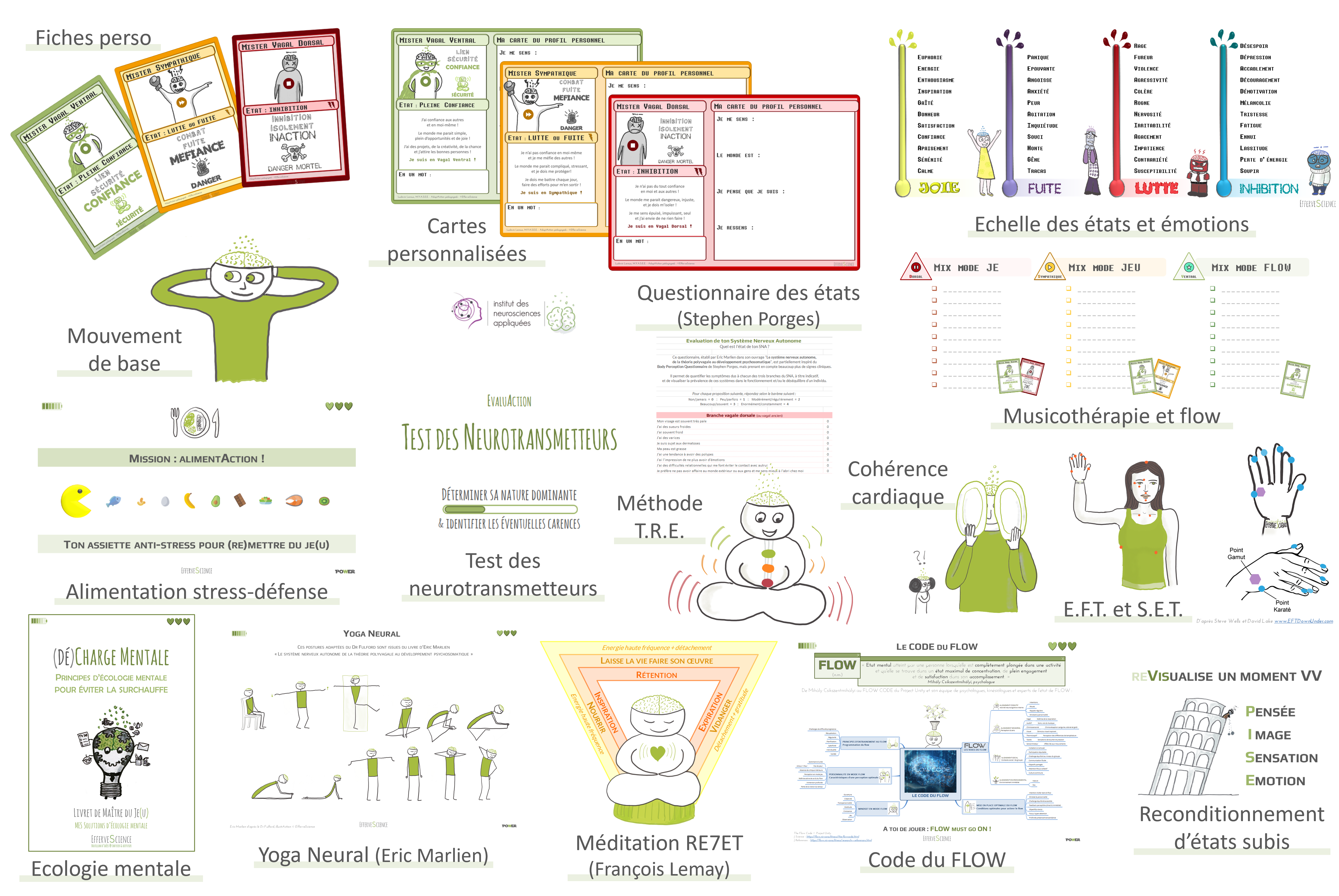 Tu as bien sûr les fiches pour mieux décoder tes états, les lier avec les émotions, cultiver le vagal ventral, identifier ton état dominant, détecter d'éventuelles carences en neurotransmetteurs, adapter ton alimentation, poser tes limites, lâcher prise, déployer une bonne écologie mentale, débloquer tes états figés, augmenter ta flexibilité vagale, reconditionner tes perceptions passées, identifier ses parts, mieux communiquer, apprendre à s'autoréguler et co-réguler, cultiver ton énergie, jouer avec le FLOW...